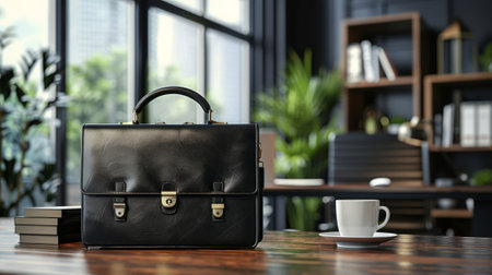 modern office essentials, modern office desk with black briefcase, laptop, and coffee cup creates a banner symbolizing productivity and success in business enterprises