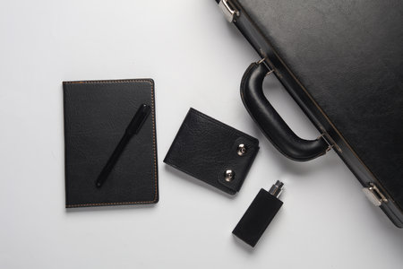 Leather suitcase with notebook and purse on a white background. Business concept. Top view