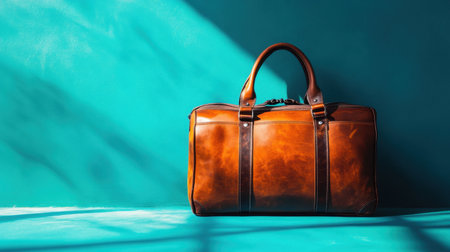 A chic and stylish tan leather travel bag isolated on a turquoise background, highlighting its design and quality, perfect for travel and fashion-related projects.