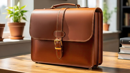 A stylish brown leather briefcase sits on a wooden surface, suggesting an office or study setting. The image showcases the briefcase's polished texture and design. Warm lighting enhances the object, with blurred potted plants visible in the background. Suitable for business, finance, or corporate promotional materials.