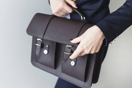 Future businessman holding, close up, leather briefcase while staying on street outdoor in city. leather bag with golden belt on gray stone background. Copy space available.