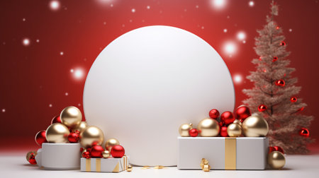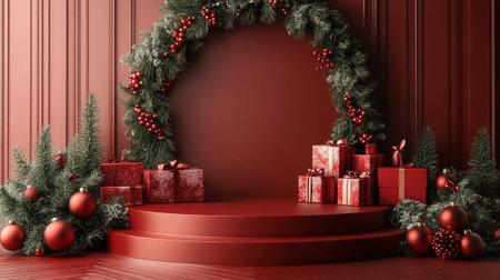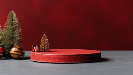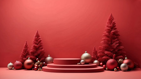 Red festive podium decoration with New Year's attributes, Christmas trees,toys,tinsel.Generative AI