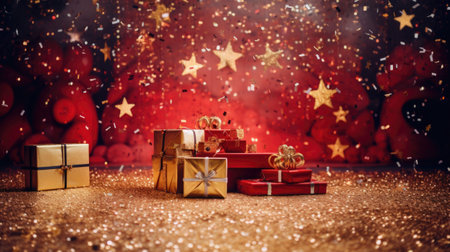 The a festive holiday scene with red Christmas gifts wrapped in shiny paper and adorned with gold bows. Gold ornaments and strings of lights are scattered around the gifts, creating a warm and cheerful atmosphere. The background is a deep red with sparkling confetti, enhancing the celebratory mood. The composition is vibrant and inviting, capturing the essence of the holiday season.