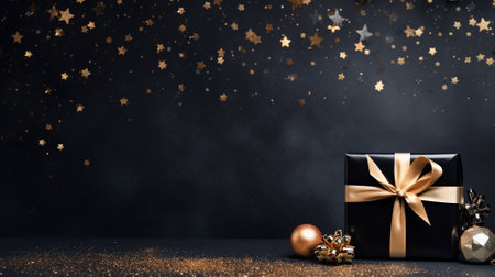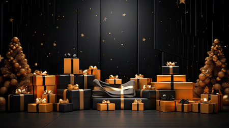 Elegant and Festive Background Design Featuring an Array of Gifts, Gold Spheres, and Glitters