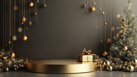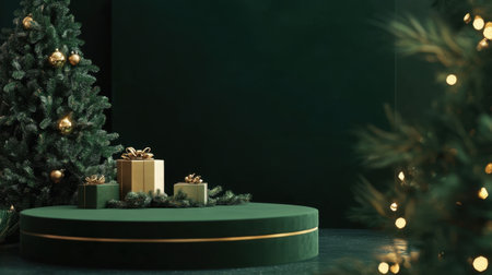 Minimalist Christmas podium display with lush green tones, gold accents, and warm lighting for seasonal product showcases.