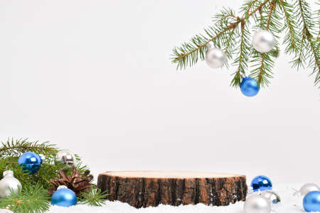 Minimal. Christmas background with a podium for product presentation and a fir branch with blue glass balls. Copy space. Flat lay, top view.