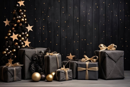 Christmas presents and christmas tree on black wooden background with golden lights.