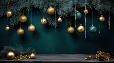 Bright stylish New Year background with green and gold Christmas balls. Christmas green backdrop with sequins and beads. Holiday decorations. Copy space. Generated by AI.