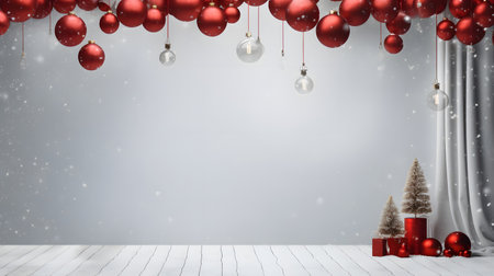Festive Christmas background displaying golden frame, ornaments, ribbons, and red velvet curtains, ideal for holiday advertising and promotions