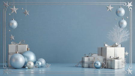 Timeless winter design featuring blue ornaments, soft silver sparkles, and gift boxes wrapped in classic frosted tones.