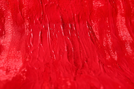 A close-up, macro view of a swirling mass of vibrant red glitter mixed with a glossy liquid. The texture is dynamic and fluid, with waves and ripples formed by the movement of the liquid. Tiny particles of glitter catch the light, creating a sparkle and shine throughout the composition. The rich, deep red color is intense and This abstract evokes a sense of luxury, glamour, and festive energy, with its glossy surface and shimmering particles. It could represent cosmetic products, abstract or...