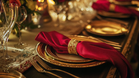festive red and gold elegant background illustration shimmering rich, textures dining, celebration tableware festive red and gold elegant background