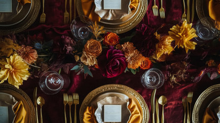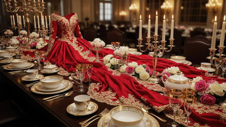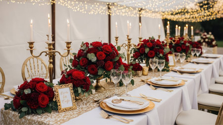An inviting table setting features a long white tablecloth adorned with gold accents and vibrant red roses. Candles provide warm lighting, illuminating the scene. The composition suggests an indoor event, suitable for commercial or editorial applications, creating a sense of luxury and celebration.