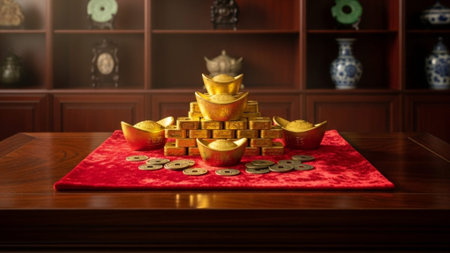 Ultrawide cinematic still life of faux gold Yuanbao ingots and replica bronze coins placed on a scar