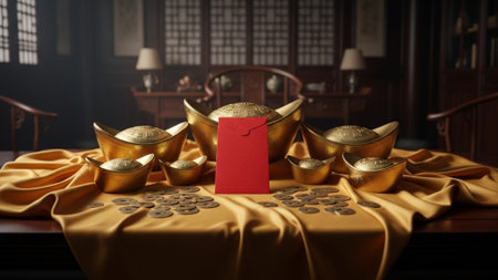 A cinematic environmental wide shot (16:9) capturing the symbolic display of fanned red envelopes (H