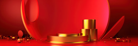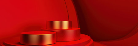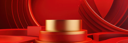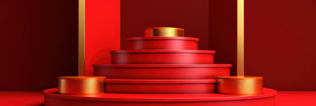 Red background podium with a three-dimensional golden circle and wooden platforms