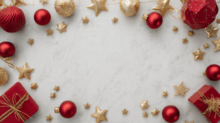 Classic festive frame filled with golden star clusters, glossy red ornaments, and neatly wrapped presents arranged symmetrically.