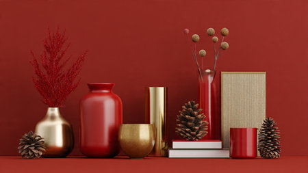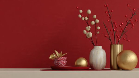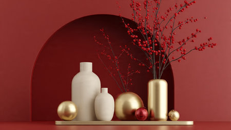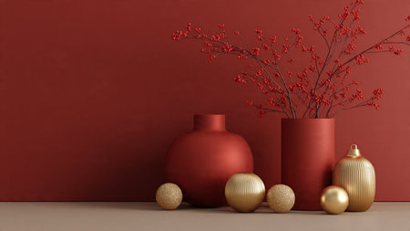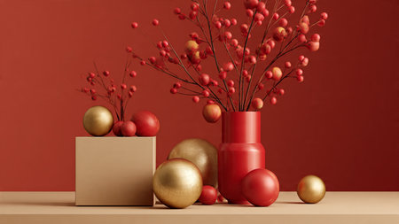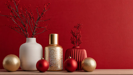 Modern red and gold winter scene with a decorative vase and red berry plant.