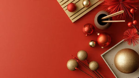 Chinese New Year Decorations in Red and Gold Featuring Lanterns, Flowers, and Ornaments. Concept of Festive Celebration, Cultural Tradition, Holiday Decor, and Vibrant Aesthetics. Background.