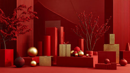 A vibrant red holiday scene featuring an array of gift boxes and festive ornaments, set against a striking red background.
