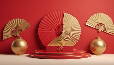 3d rendering of red podium for product display and japanese fan