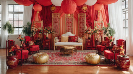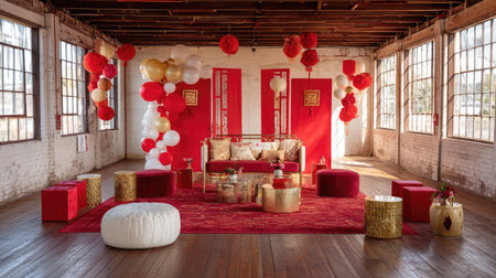 A stunning interior space adorned with rich red hues, elegant seating, and festive lanterns, ideal for cultural celebrations and stylish gatherings.