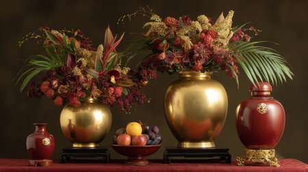 A captivating still life display featuring elegant floral arrangements in shiny golden and rich red vases, complemented by colorful fruits on a red tablecloth.