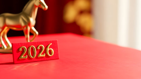 Banner. Shiny gold numbers 2026, red balls and a horse, and a beautiful bokeh on a blue background. Happy New Year and Christmas.