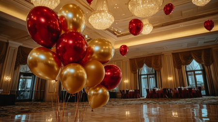 An eye-catching arrangement features red and gold balloons, creating a vibrant display. The composition includes a shimmering gold backdrop, possibly indoors. The overall aesthetic suggests a celebratory environment, suitable for various editorial and commercial applications. The design is intended for use in announcements and celebratory visual contexts.
