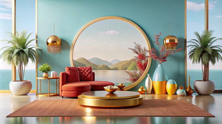 Modern living room with a red sofa, gold accents, and a circular window overlooking a scenic view.