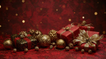 A beautifully arranged holiday scene featuring elegant gift boxes, rich red background, and decorative elements like pinecones and ornaments, perfect for seasonal celebrations.