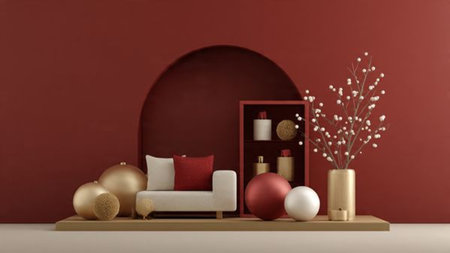 Minimalist design merging deep red surfaces with selective gold holiday accents.