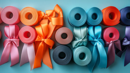 Satin ribbon in various colors arranged in a spiral pattern, ideal for festive decoration concepts -