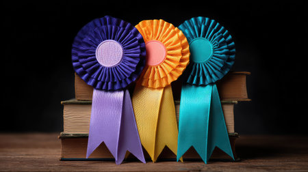 Vibrant award ribbons rest on stacked vintage books, symbolizing achievement and recognition. Ideal for themes of success and motivation in creative projects.