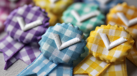 A vibrant arrangement of checkered ribbons in blue, purple, green, and yellow, perfect for celebrations, awards, and crafting projects.