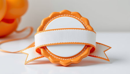 An orange and white celebration badge with blank center and ribbon on white surface, bright and festive design for award or recognition