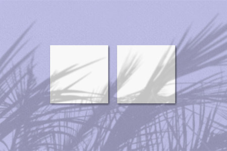 Natural light casts shadows from the plant on 2 square sheets of white textured paper lying on a violet textured background. Mockup.