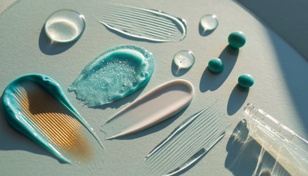 Artful flat lay of cosmetic textures: clear gels, smooth creams, and colorful beads on a clean surface, perfect for beauty, wellness, and scientific product showcases.