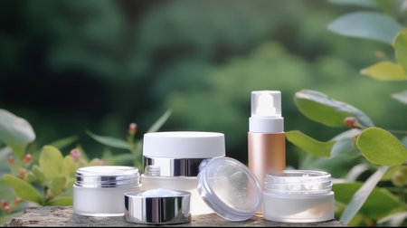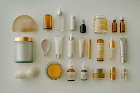 A diverse collection of skin care jars, tubes, oils, and serums showcases an inviting and organized layout designed for promotional use.