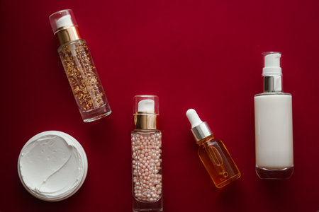 Skincare cosmetics and anti-aging beauty products, luxury skin care bottles, oil, serum and face cream on red background.