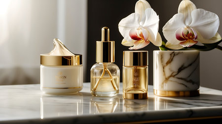Elegant arrangement of skincare products in gold packaging on a marble surface with soft bokeh lights in the background