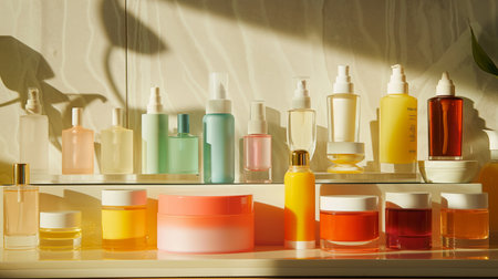 Stylish cosmetic bottles arranged against a colorful background, featuring a modern and trendy design with vibrant colors.