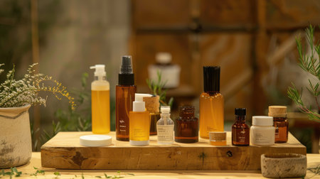 This image displays an assortment of personal care and beauty products. Items like lotions oils and a bar of soap are neatly arranged on a wooden tray. A small potted plant adds a natural element. The collection evokes self-care and wellness.