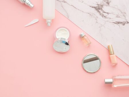 Curative hygiene face care products isolated pink copy space background. Lotion pumper, perfume, mirror, shower gel, body wash, shampoo bottle, cream