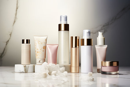 A collection of high-end skincare and makeup products displayed elegantly on a marble countertop, with soft, natural lighting highlighting their textures