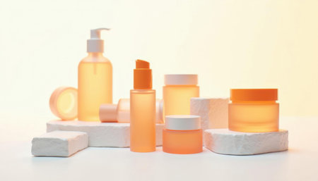 A collection of skincare products in orange and white tones, arranged on white pedestals with a warm, soft background.
