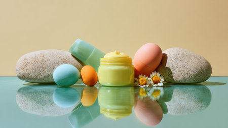 A vibrant arrangement featuring a yellow cosmetic container, smooth stones, and colorful eggs, reflecting a cheerful springtime aesthetic perfect for beauty and wellness themes.