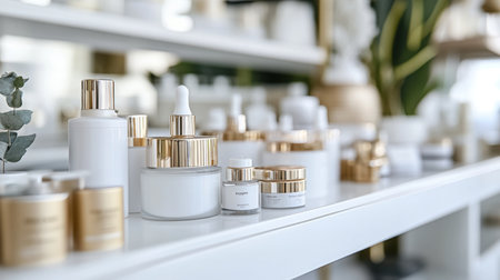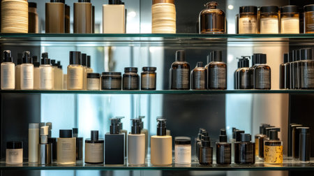 A chic and organized shelf filled with a diverse range of skincare and beauty products, highlighting modern design and a sophisticated approach to self-care and wellness.