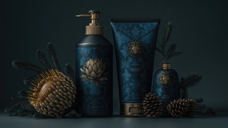 This elegant bottle set features intricate floral designs and a dark background, showcasing luxury beauty products ideal for spa or home decor.