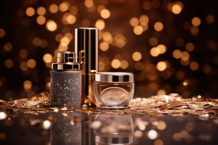 Gold makeup products on golden glitter surface, cosmetic ads template. Container for glitter bottle mockup on dazzling background. Cylindrical jar, festive and luxurious atmosphere